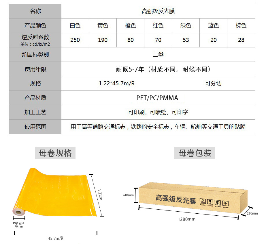 【產(chǎn)品材質(zhì)】PET/PC/PMMA,反光性能優(yōu)異,可用于各種公路,鐵路,航道和城市主干道的交通標志導向牌,指示牌,礦山機場安全牌,以及車輛,船舶的車身反光貼膜